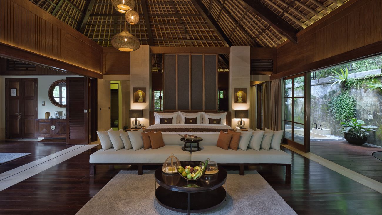Nestled within the rainforest and accessible via a private funicular from the main lobby, guests are welcomed through a hand-carved teak door from Jepara into a Joglo-style reception hall, complete with a private bar and wine cellar — a nod to Javanese noble architecture. Built over six years by 600 artisans, the villa is a spectacular showcase of local craftsmanship.